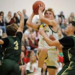 Deer Lakes’ Collin Rodgers attempts to drive between Belle Venon’s Trevor Kovatch (left) and Luca Ghilani on Dec. 27 at the Deer Lakes Christmas Tournament.