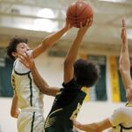Deer Lakes’ JT McCue blocks a shot by Elijah Moore of Belle Vernon during their game Dec. 27 at the Deer Lakes Christmas Tournament. The Lancers beat the Leopards, 71-59.