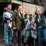 Gabi Hughes (right) an environmental educator with the Audubon Society of Western Pennsylvania, points out a bird to (from left) Ryan Hoover, with youngest son, Jordan Hoover, 4; Nicole Hoover; Andrew Hoover, 9; and Daniel Hoover, 6, during the Audubon Society of Western Pennsylvania’s annual Christmas Bird Count on Dec. 28 at Beechwood Farms Nature Reserve in Fox Chapel. Sergey Kodia (far left), 6, uses binoculars to spot birds while participating with the group.