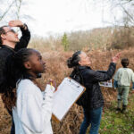 Stacy Ogutu, 10, records birds on a clipboard and Alex Dragon, of McCandless, looks on as environmental educator Gabi Hughes directs their attention upward during the Audubon Society of Western Pennsylvania’s annual Christmas Bird Count on Dec. 28 at Beechwood Farms Nature Reserve in Fox Chapel.