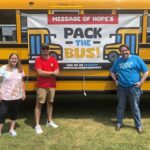 Bus driver Cindy Moore joins Jonathan Fulton (center) and Adam Miller, president and vice president, respectively, of Message of Hope Ministries, outside her bus for the Apollo outreach ministry’s inaugural Pack the Bus event July 20 at Owens Field. The outreach hopes to gather enough school supplies to fill 1,500 backpacks for the Apollo-Ridge School District.