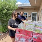 Jaidon Hughes, an employee at Highlands Family Center in Tarentum, works with Che Fuqua of the Greater Pittsburgh Community Food Bank to distribute food to residents on Wednesday.