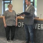 Lower Burrell Mayor Chris Fabry recognizes Jean Lindemuth, who worked in the city’s treasurer’s office for 42 years. Lindemuth retired May 3 as deputy treasurer.