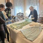 Joan Stewart of Oakmont’s Kerr Museum shows delicacy of fabric and demonstrates weight of beading to Burrell High School students Kassidy Sutton, Brooklyn Simpson and Jori Beecan on May 29.
