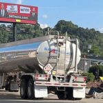 The driver of a gas tanker truck created his own shade as he made a delivery to the Marathon station in Tarentum on Monday.