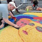 Erik Frantz, of Harrison, works on a sawdust carpet depicting the Madonna and child during Guardian Angel Parish’s observation of the Feast of Corpus Christi at Our Lady of Victory in Springdale Township on June 2 . He was among about 100 people who used colored sawdust to create 15 carpets measuring 12 feet by 15 feet in the church parking lot.