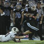 Burrell quarterback Stephen Hasson (6) finds room to run up the sideline past Deer Lakes’ Pier Williams (32) and Joey Ashi on Oct. 25.