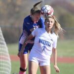 Burrell’s McKenna Miller (3) heads the ball in front of Mt. Pleasant’s Adi Belanger during their WPIAL Class 2A quarterfinal on Oct. 26 at Mt. Pleasant.