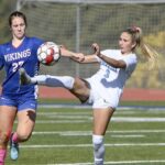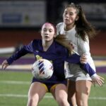 Burrell’s McKenna Miller (right) battles for possession of the ball with Mt. Pleasant’s Isabel Overly during their WPIAL Class 2A quarterfinal on Oct. 26 at Mt. Pleasant.