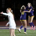 Plum’s Emily Grubich celebrates with Olivia Bigger after scoring against Moon during their WPIAL Class 3A quarterfinal on Oct. 24 at Plum.