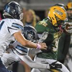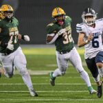Leechburg’s Jayden Floyd avoids a tackle attempt by Greensburg Central Catholic’s John-Michael Landa on Oct. 25 at Leechburg.