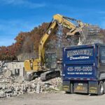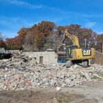 Crews from Massarelli Demolition clear away debris on Monday as they begin the work of demolishing the old Plum Borough Building on New Texas Road in Plum.