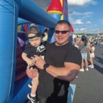 Dave Endlich, 35, of Lower Burrell and son, Noah, 1, are seen on the church grounds outside the bounce castle at the St. Margaret Mary Festival of Friends in Lower Burrell on Saturday.