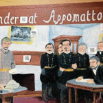 A new mural has been added nearly every year since. The student re-creation of the photograph “Flag Raising at Iwo Jima” is paired with an audio box with buttons for passersby to press. Students’ voices come from speakers mounted in the ceiling, sharing history about the painting and the original event. Another piece depicting Confederate forces’ surrender at the Appomattox Courthouse is painted beneath a TV monitor playing student-produced documentary footage.