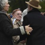 Judah Samet (facing camera) is greeted by Dan Leger of the Dor Hadash Congregation during a commemoration ceremony for the 11 victims killed three years ago in a shooting at the Tree Of Life Synagogue on Wednesday, Oct. 27, 2021 in Schenley Park. Samet, a Holocaust survivor, narrowly missed the shooting at the Tree Of Life because he was running late that day.