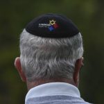 A person is seen wearing a “Stronger Than Hate” kippah during a commemoration ceremony for the 11 victims killed three years ago in a shooting at the Tree Of Life Synagogue on Wednesday, Oct. 27, 2021 in Schenley Park.