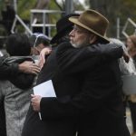 People embrace during a commemoration ceremony for the 11 victims killed three years ago in a shooting at the Tree Of Life Synagogue on Wednesday, Oct. 27, 2021 in Schenley Park.