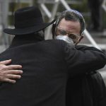Marty Gaynor of the Dor Hadash Congregation (facing camera) hugs Tree Of Life Rabbi Jeffrey Myers during a commemoration ceremony for the 11 victims killed three years ago in a shooting at the Tree Of Life Synagogue on Wednesday, Oct. 27, 2021 in Schenley Park.