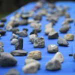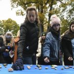 People place rocks with messages on them on a table during a commemoration ceremony for the 11 victims killed three years ago in a shooting at the Tree Of Life Synagogue on Wednesday, Oct. 27, 2021 in Schenley Park.