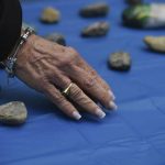 A person places a rock with a message on it on a table during a commemoration ceremony for the 11 victims killed three years ago in a shooting at the Tree Of Life Synagogue on Wednesday, Oct. 27, 2021 in Schenley Park.