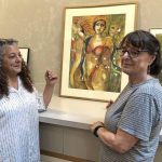 Co-chairs Lisa Rasmussen (left) and Suzie Sparks prepare to hang works at Greensburg Art Center for Pittsburgh Watercolor Society’s "75th + 1" exhibition.