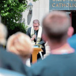 The Rev. Eric Dinga, a pastor in Latrobe, participates in an outdoor prayer service at Greensburg Central Catholic High School on Friday, June 14, 2019, to remember a recent graduate and another former student who were killed by lightning a day earlier.