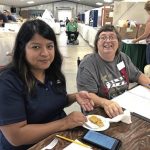 Sandy Feather (left), a Penn State Extension green industry team member, evaluates market baskets submitted by Westmoreland County 4-H members at the Westmoreland Fair on Friday.