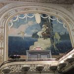 3. The theater’s loge is graced on either side by a large, fairy tale-themed Louis Grell mural. The since-restored murals were covered for years with tapestry and furring strips that did substantial damage. There is a third mural under a coat of paint above the stage’s proscenium arch. It has not yet been determined if the paint can be removed without damaging the work underneath.