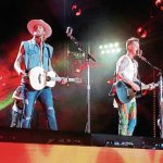 Music superstars sometimes seem larger than life — in the case of country duo Florida George Line, they will be just that, during a live concert film Saturday on the big outdoor screen at Evergreen Drive-In near Mt. Pleasant.