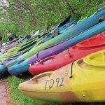 Kayaks line the banks of Loyalhanna Creek in Latrobe for the ninth annual Loyalhanna Sojourn on Saturday, May 13, 2023.