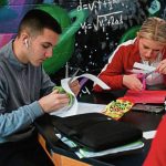 Over the course of a 40-minute physics class led by Seton Hill University seniors Mackenzie Longo and Brady Whalen, students stretched to their tippy toes before dropping a paper whirlybird and timing how long it took to fall to the floor.