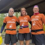 Lisa Cimbala and husband Alan Hill, of Irwin, spent Saturday morning walking around B-Y Park with friend Joe Silverio of Trafford, able to find one another easily with matching orange “Joe’s Coffee Club Runners” shirts on.