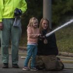 Elisea Franklin, 5, of Greensburg, fires a hose at pop-up targets with the assistance of Taylor Levendosky of Bovard and a firefighter with Hempfield Township’s Bovard Station on Tuesday for the 24th annual Hempfield-Greensburg Fire Prevention Day in the parking lot of Westmoreland Mall.
