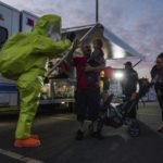 Adorned in a full chemical protective suit, Westmoreland County HAZMAT Team volunteer Kevin Younkin of Scottdale gives out high-fives to families as they pass by on Tuesday for the 24th annual Hempfield-Greensburg Fire Prevention Day in the parking lot of Westmoreland Mall.