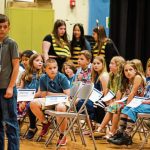 Competitors from Hempfield, Greensburg Salem and Aquinas Elementary schools received a warm welcome as they were led onto the stage by ninth graders dressed as bees. A recording of the song “Gonna Fly Now” by Bill Conti, a song popularized by the “Rocky” movies, blared over the loudspeakers as the spellers waved to their friends and families in the audience.