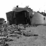 Rough seas and gale force winds pushed LST-422 into a German minefield, where a mine detonated the landing craft’s flammable cargo.