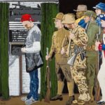 The painting depicts a young man outside of a voting booth, with figures clad in military uniforms from various eras standing behind him.