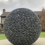 The Harber piece at SAMA is one in a series of “Dark Planet” sculptures, made either of irregularly shaped river stones or shards of slate, painstakingly placed to create a unified whole.