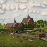 “Steele Farm” depicts a large house on a rise at the center of the work, overlooking outbuildings, a garden and cows in a field. At the left, the farmer approaches his home in a horse-drawn wagon.
