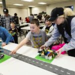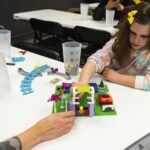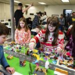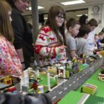 Aynsley Crissman, 9, of North Huntingdon, center, tries out a Lego slide as children place their final builds into a town on Feb. 17 during the inaugural community Lego building event at First Presbyterian Church in Irwin.