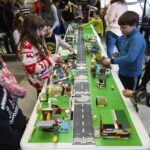 Kids and parents place their creations on a Lego roadway in order to form a town on Feb. 17 during the inaugural community Lego building event at First Presbyterian Church in Irwin.