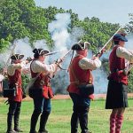 Scott Perry of Greensburg, will portray British Col. Henry Bouquet during the Battle of Bushy Run re-enactment on Aug. 6 and 7 at the battlefield along Route 993 in Penn Township. He is standing before a sculpture of a Battle of Bushy Run scene that initially was erected along the Ohio River Boulevard in Pittsburgh. Bouquet is portrayed in the far right of the sculpture.