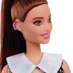 Last month, Mattel released a Barbie doll with hearing aids. She wears a floral dress, pink boots and has her hair in a ponytail. Two over-the-ear hearing aids are visible.