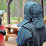Mullin and Bailey both take time to carefully add each piece of protective equipment, from body padding to hard plastic gauntlets that shield their hands. The puffy pants don’t serve any strategic or protective purpose, but they are generally part-and-parcel with much of the other HEMA equipment offered by Polish companies like Spes, where Mullin purchased a lot of his gear.