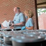John Herrmann, left, and Sherry Anderson, a fellow volunteer with nonprofit Feeding the Spirit, prepare meals for a June 2020 distribution to those in need. Because of health guidelines during the early months of the covid-19 pandemic, the event was held outdoors, at Greensburg’s St. Clair Park.