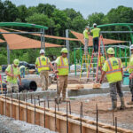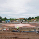 On about 14 acres, the park will include numerous elements: two pavilions, water table, splash pad, natural playground, concession building with bathrooms, shaded outdoor seating, fitness area with multiple pieces of exercise equipment, yoga deck and obstacle course. The shell of the multipurpose building has been erected, as has much of the splash pad and some pieces of exercise equipment.
