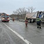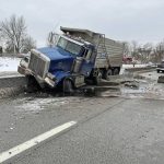 The crash occurred after 8:30 a.m., a dispatch supervisor for Westmoreland County Emergency Management reported. Authorities said a tri-axle truck became lodged on top of the concrete median barrier after colliding with a car along the eastbound lane at Exit 42.