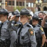 State troopers salute during a Westmoreland County Law Enforcement Memorial Service outside the Westmoreland County Courthouse on Thursday.