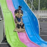 Chris Goodman of Youngwood took his 4-year-old daughter, Emilia, down a colorful slide on a burlap bag.