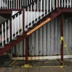 The remaining police caution tape is seen on the stairs to a deck at Monday’s Union Restaurant in Unity on Tuesday, Dec. 10, 2024 as the establishment reopens following a sinkhole accident behind the property last week. Elizabeth Pollard was looking for a cat last Monday evening when the ground gave way under her and she fell into a sinkhole that opened into an abandoned mine. The 64-year-old Unity resident died.